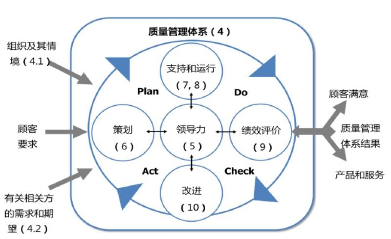ISO 9001标准内容分为10个章节,主体部分按照PDCA的思路设计,标准的第4章(组织环境)、第5章(领导作用)、第6章(策划)是“P”的过程,第7章(支持)、第8章(运行)是“D”的过程,第9章(绩效评价)是“C”的过程,而第10章(改进)是“A”的过程。